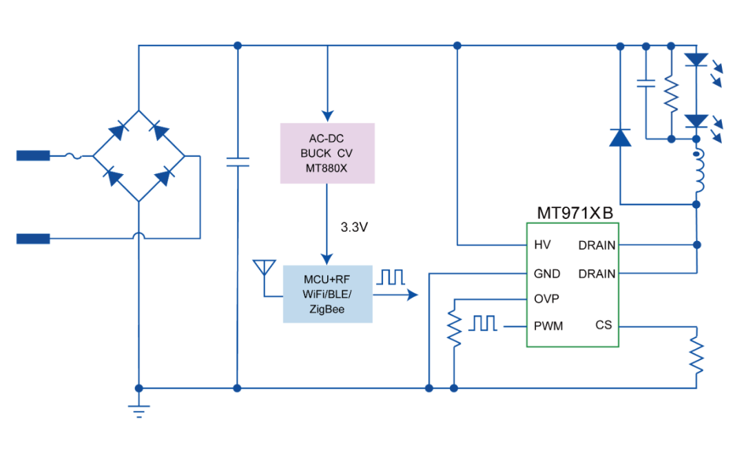 美芯晟科技推出模似調(diào)光平臺LED應(yīng)用系列的新成員MT971XB,助力實(shí)現(xiàn)新一代智能照明。該器件是全程模似調(diào)光非隔離降壓型LED恒流驅(qū)動方案。芯片采用美芯晟自有專利技術(shù),擁有千分之一調(diào)光分辨率、全程調(diào)光無頻閃且具有穩(wěn)定的OVP保護(hù)功能、超低待機(jī)功耗<40mW@AC265V, 大幅提升智能燈的性能,給用戶帶來極致的體驗(yàn)。