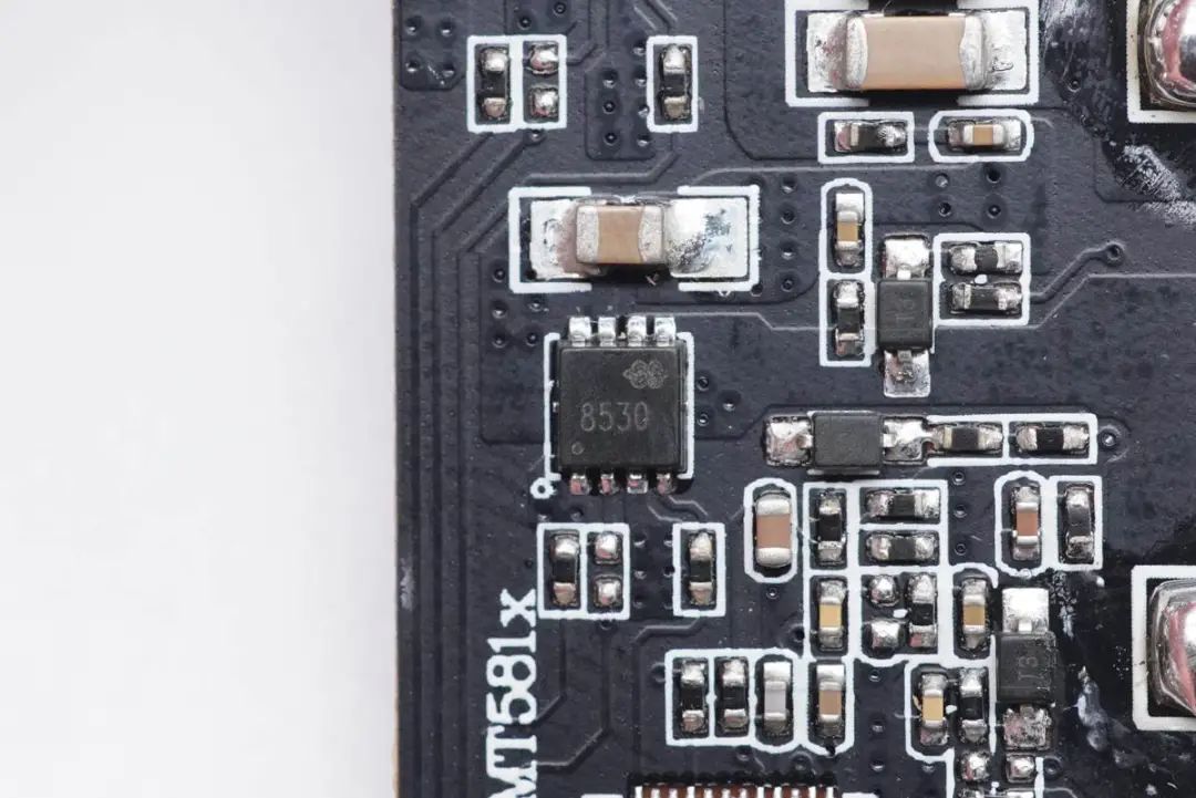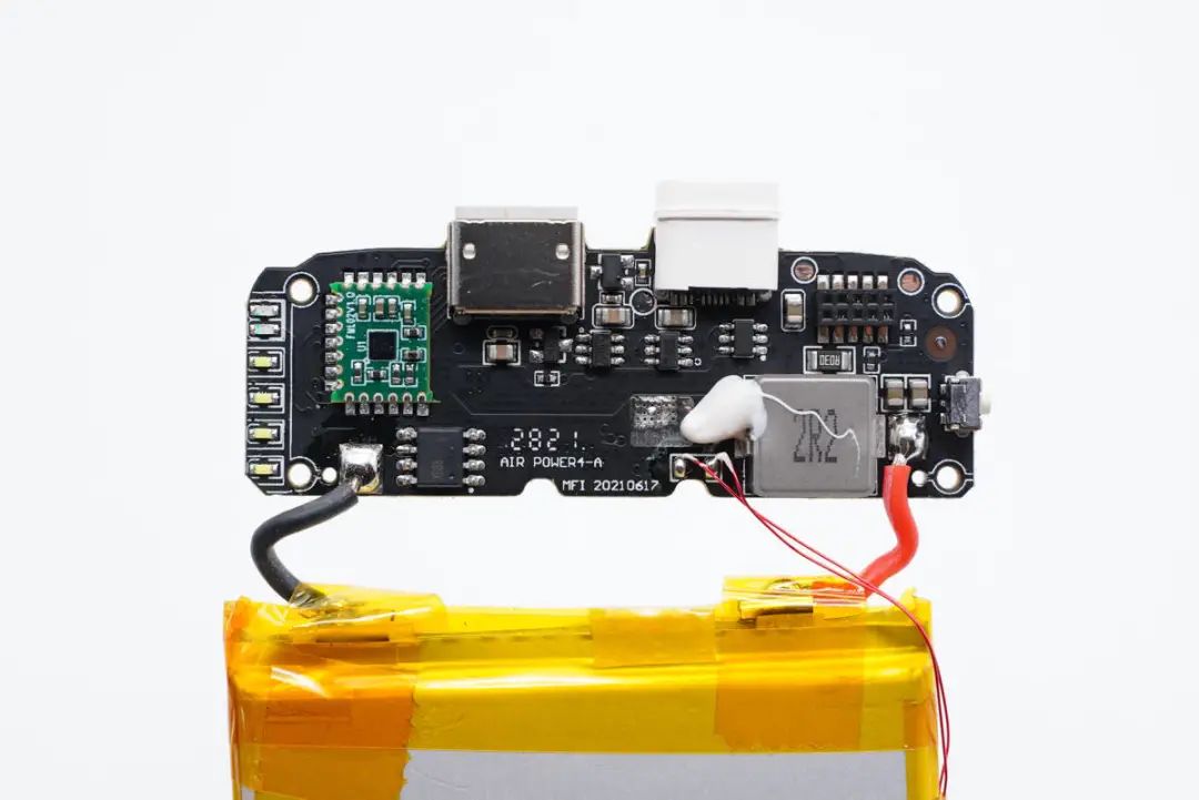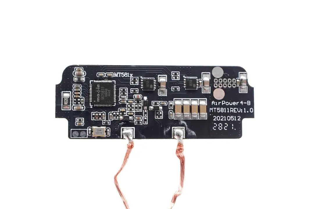 充電頭網(wǎng)通過(guò)拆解了解到,充電寶內(nèi)置兩塊PCB小板,之間有泡棉支撐。無(wú)線充方案采用美芯晟MT5811,這是一款高度集成的無(wú)線充電發(fā)射芯片,符合Qi標(biāo)準(zhǔn)以及高達(dá)15/50W的輸出功率,還集成ARM M0 處理器,總的來(lái)說(shuō)在體積、兼容性、性能、效率等方面的表現(xiàn)都很好,能夠滿足客戶的各種要求。
