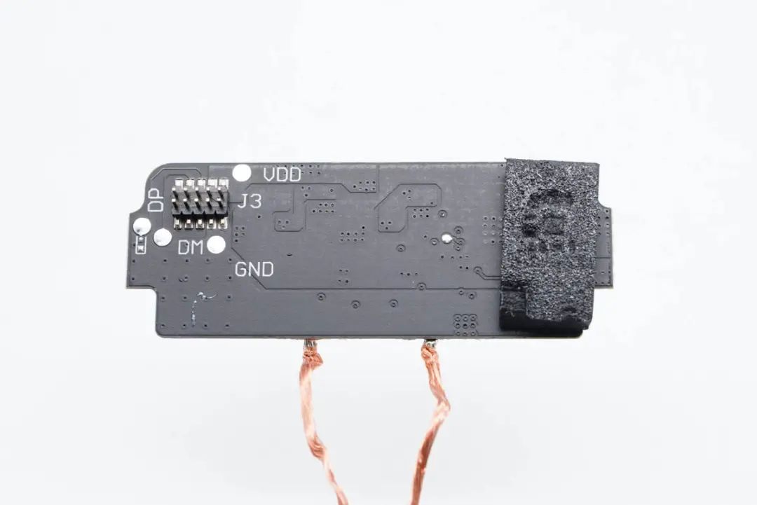 上層小板是無(wú)線充電路板,正面設(shè)有無(wú)線充電發(fā)射芯片、MOS管以及NPO諧振電容,并焊接無(wú)線充電線圈。