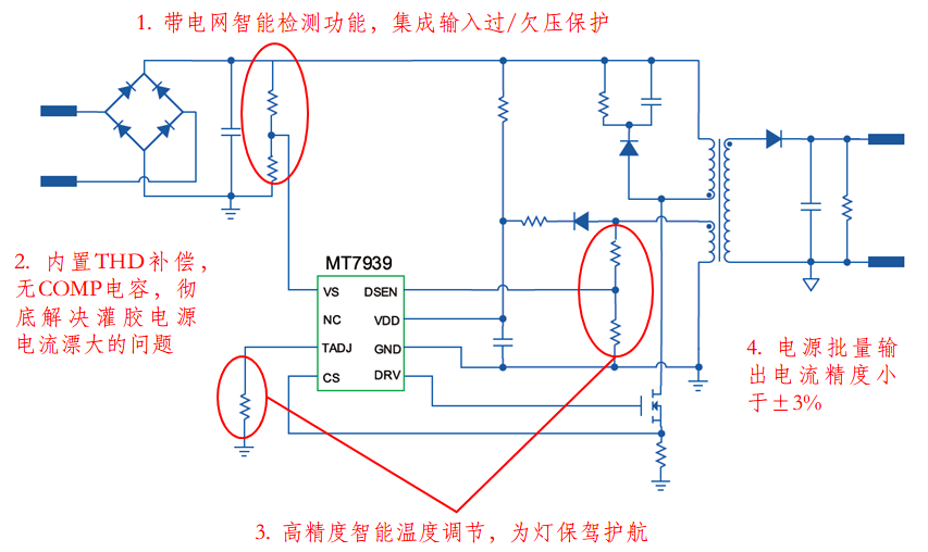 解決客戶LED驅(qū)動應用中的痛點是美芯晟追求的目標,針對這些痛點我們成功推出了集成輸入過壓/欠壓保護的高PF超低THD恒流解決方案-MT7939。