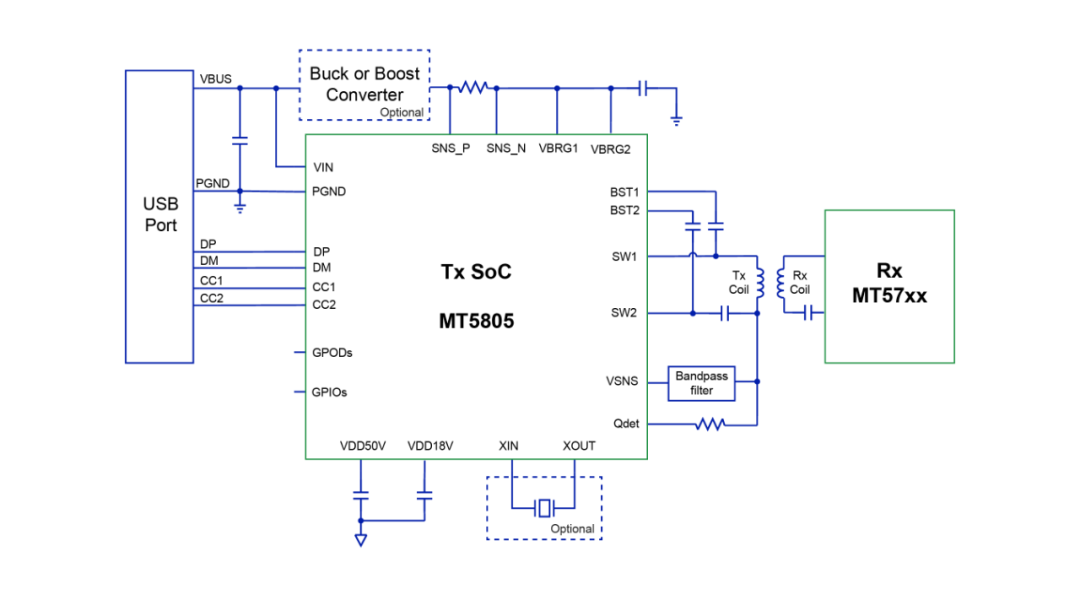 MT5805支持過壓保護(hù),過流保護(hù),欠壓保護(hù)和過熱保護(hù),還內(nèi)置了動(dòng)態(tài)功率限制,支持動(dòng)態(tài)降功率輸出。芯片采用FCQFN3*4-24L封裝,適用于智能手機(jī)及可穿戴設(shè)備的無線充電發(fā)射端,醫(yī)療設(shè)備,家用電器以及工業(yè)設(shè)備的無線充電應(yīng)用。