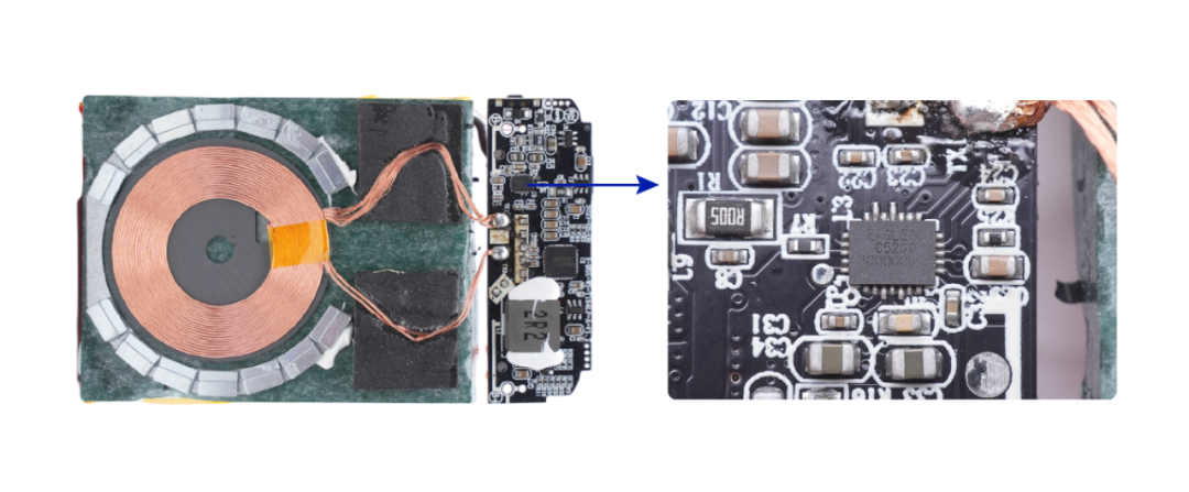 這款移動(dòng)電源的無線充電芯片來自美芯晟的MT5805,該芯片是一顆低功耗無線充TX芯片,支持15W輸出功率,4-20V輸入電壓,內(nèi)置快充取電功能,支持UFCS融合快充,PD3.0,QC,F(xiàn)CP,SCP協(xié)議,支持單芯片無線充電器應(yīng)用。內(nèi)部集成32位 M0處理器,32KB MTP存儲(chǔ)器和4KB SRAM,符合WPC Qi 最新規(guī)范,支持私有無線充電協(xié)議,支持功能定制。