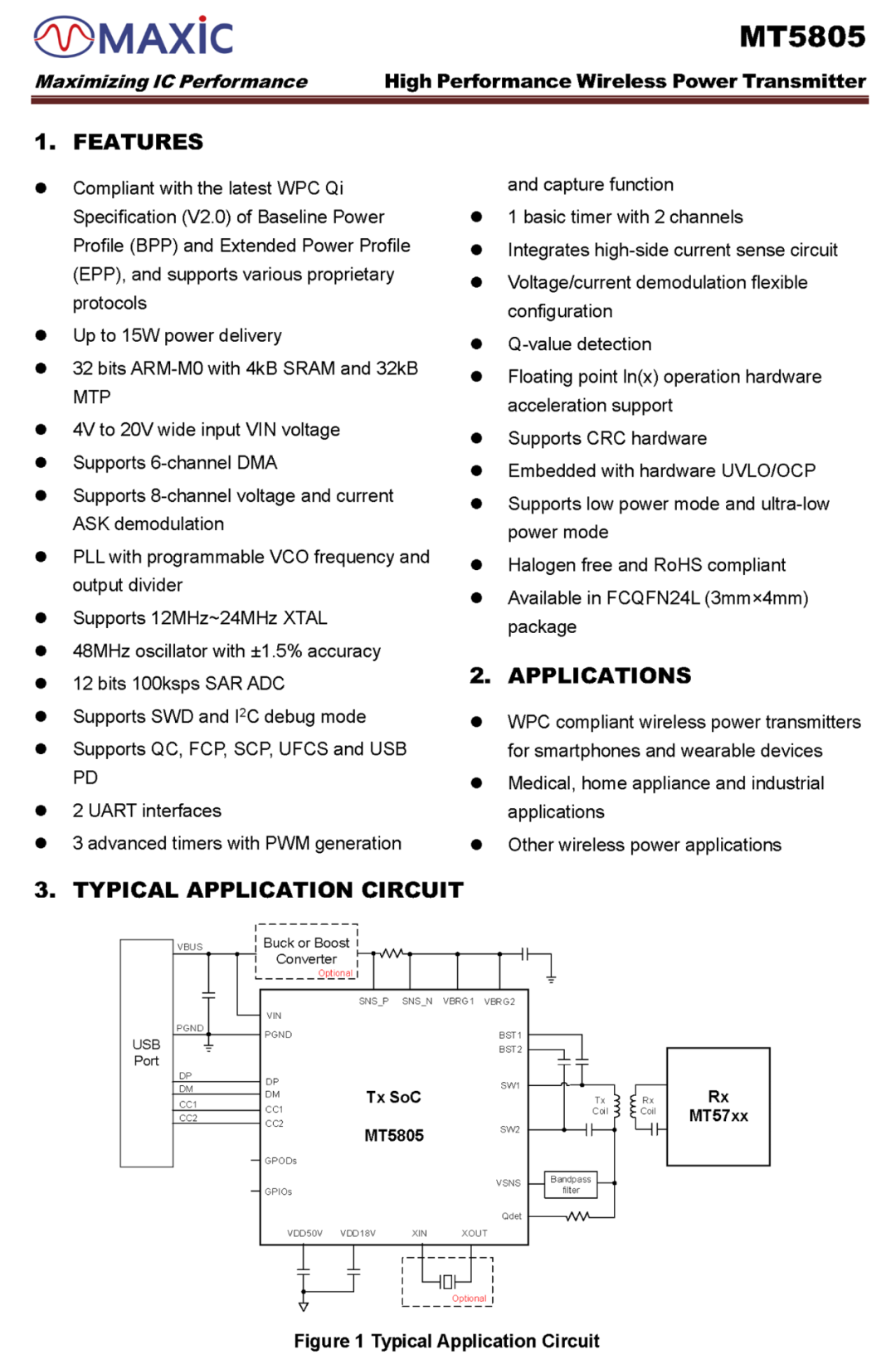 MT5805是單芯片解決方案,內部集成32位M0處理器,32KB MTP存儲器和4KB SRAM,符合WPC Qi 2.0規(guī)范,支持無線充電私有協議,支持功能定制。芯片支持15W輸出功率,4-20V寬輸入電壓,內置快充取電功能,支持UFCS融合快充、PD3.0、QC、FCP、SCP協議,支持單芯片無線充電器應用,支持超低功耗工作模式。