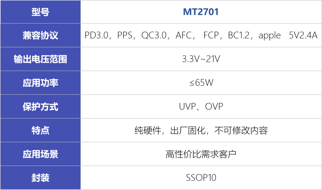 美芯晟開發(fā)的快充協(xié)議芯片包括MT2701和最新的MT280X系列,芯片兼容多種快充協(xié)議。MT2701支持65W以內(nèi)應用,兼容PD3.0,PPS,QC2,QC3,AFC,F(xiàn)CP,私有協(xié)議低壓直充5V4.5A,Apple 5V2.4A,BC1.2等常用協(xié)議。MT2701采用純硬件架構,通過外部元件來調(diào)節(jié)輸出功率段,應用簡單,BOM成本低,適合不需要USB-IF認證的客戶。