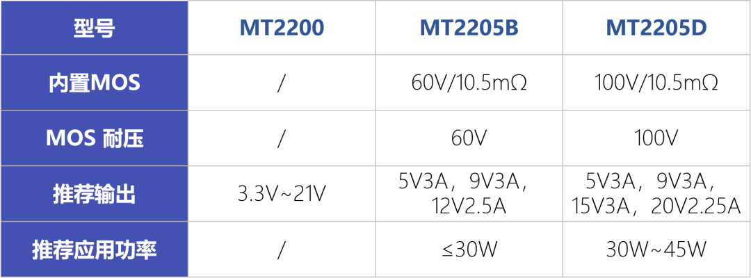 MT2200可輸出3.3V~21V,滿足USB PPS寬電壓輸出要求。MT2205內(nèi)置Si MOS,利于小型化設計。